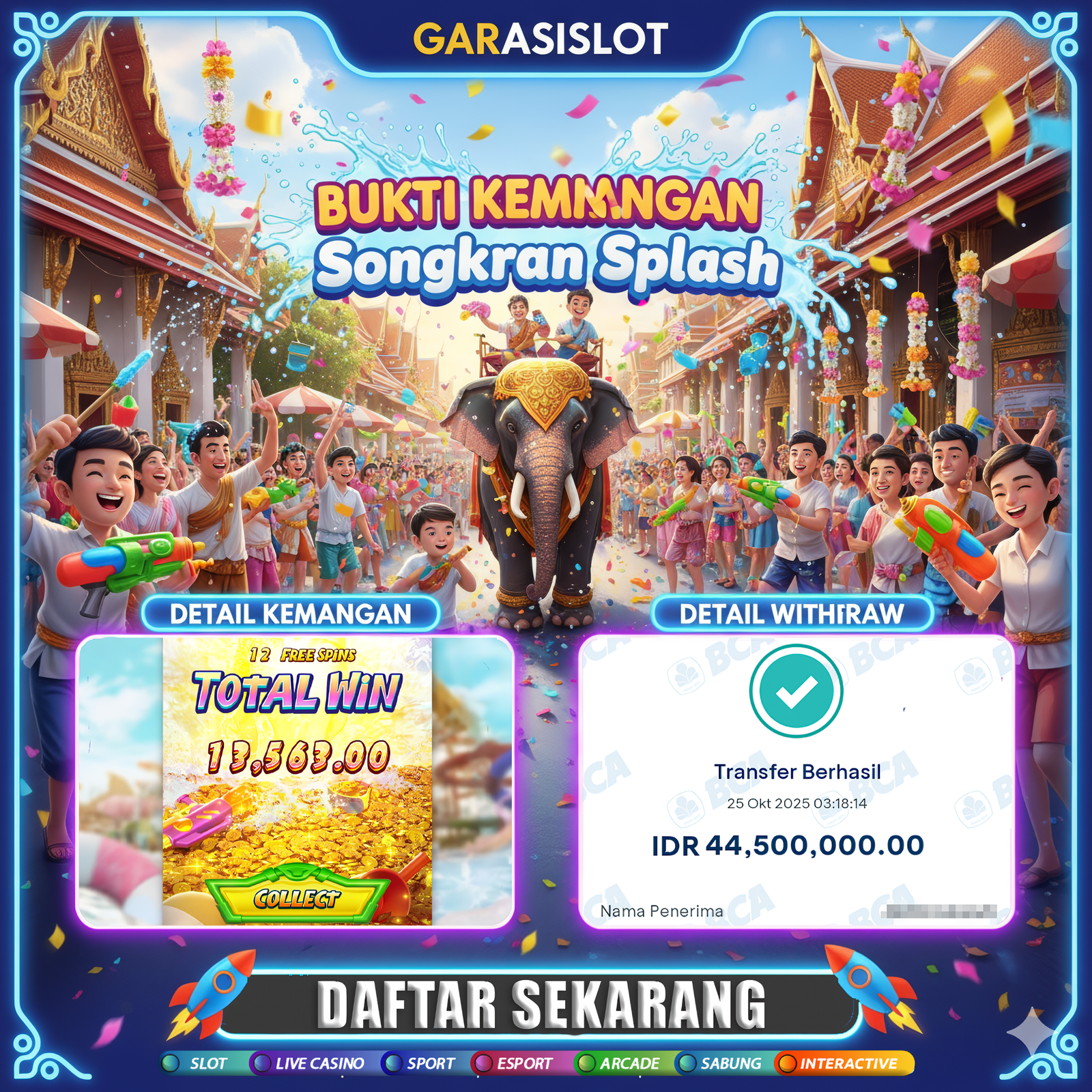 Musim kemenangan kembali tiba di GARASISLOT! Kali ini, sensasi kemenangan besar datang dari permainan slot bertema festival paling meriah di Thailand — Songkran Splash. Dengan