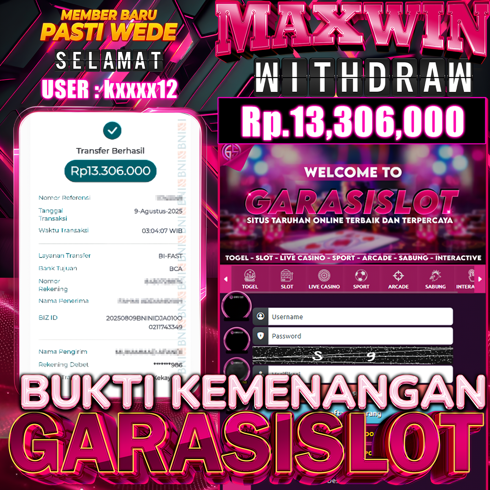 Selamat Kepada Id : kxxxx12Atas Withdraw Rp. 13,306.000 Juta Hari ini. Ditunggu Withdraw Selanjutnya dan ajak juga teman temannya bergabung di GARASISLOT