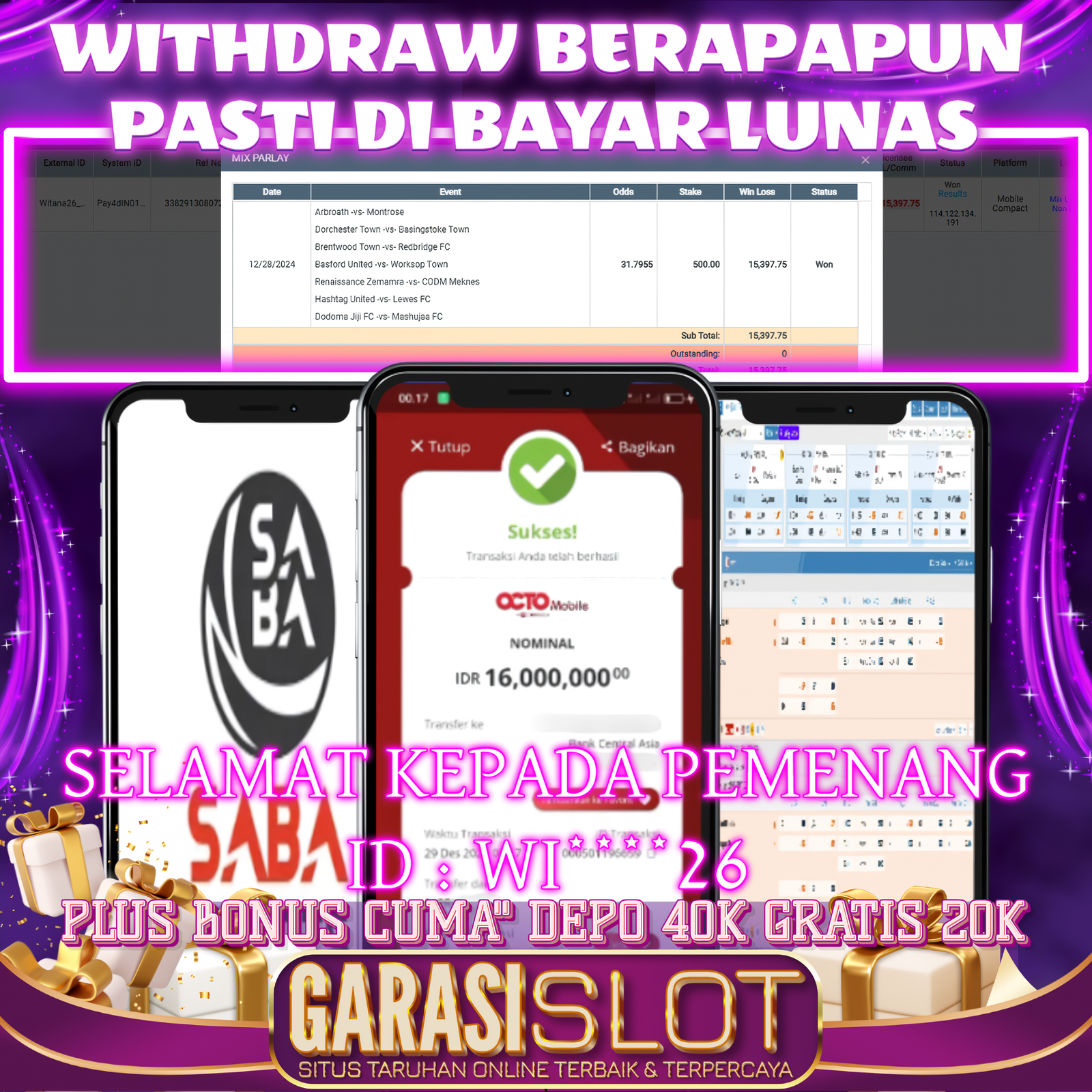 Selamat Kepada Id : je****87 Atas Withdraw Rp. 13.262.500 Juta Hari ini. Ditunggu Withdraw Selanjutnya dan ajak juga teman temannya bergabung di GARASISLOT GARASISLOT adalah situs game
